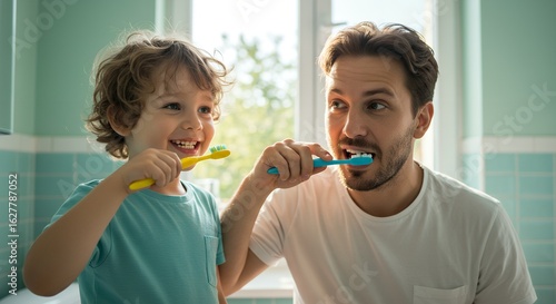 Cheerful Father and Son Brushing Teeth Together, Learning Good Dental Hygiene Habits in a Bright Bathroom