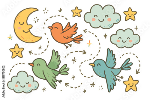 Cheerful Flight Doodle. Magical doodle long-distance flight scene with cheerful birds, cartoon moon and stars smiling, smiling