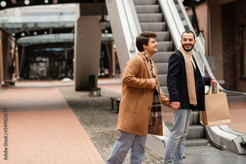 cheerful gay couple in fashionable outfit holding hands while standing with shopping bags near escalator