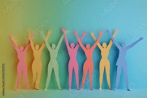 paper, people, figure, colourful, celebration, oneness, togetherness, teamwork, community, support, group, diversity, inclusion, success, achievement, vibrant, bright, cheerful, optimistic, positive, uplifting, hopeful, playful, fun, creative, artistic, design, cut-out, silhouette, standing, arms raised, joyful, happy, feminine, empowerment, sisterhood, solidarity, celebratory, optimism, hope, upbeat, friendship, together, connected, bond