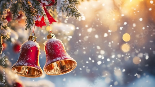 Cheerful red and gold christmas bells hanging outdoors on a snowy day with frost and bright light