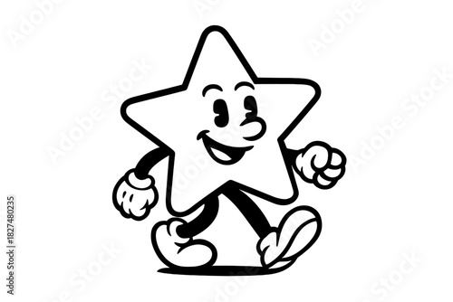 Cheerful retro cartoon star character walking with a happy expression in vintage rubber hose style