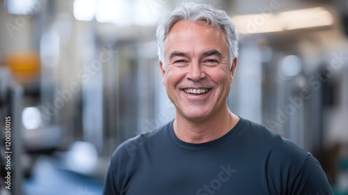 Cheerful senior man enjoying fitness in bright gym filled with blurred workout equipment