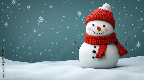Cheerful Snowman Wearing Red Hat and Scarf with Falling Snowflakes on a Winter Wonderland Background Creates a Festive Holiday Atmosphere