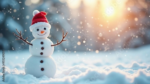 Cheerful snowman with a Santa hat enjoying a snowy day