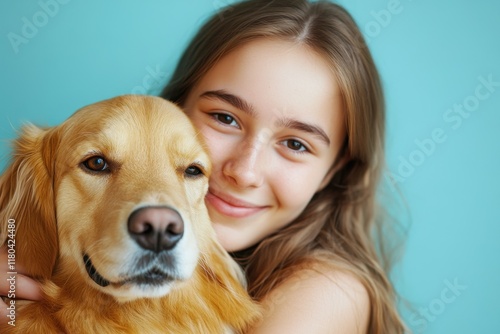 Cheerful woman in casual attire cuddles her retriever eyes closed against a light blue background Pet care theme