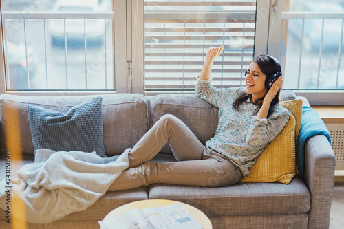 Cheerful woman listening to music with large headphones and singing.Enjoying listening to music in free time at home.Relaxing with music,music therapy.Positive mood
