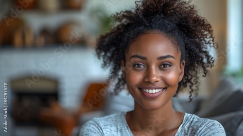 Cheerful woman with natural curls and a beaming smile in a homely setting