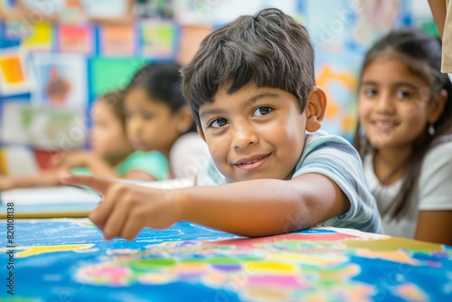 Cheerful young boy pointing at a world map during a class activity while sitting at a desk, with other students and colorful artwork in the background