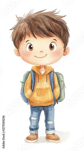 cute, boy, watercolor, art, cheerful, expression, yellow, hoodie, blue, jean, backpack, casual attire, outfit, happy, children, illustration, standing, smiling, adventure, style, playful, character, design, creative, light, colours, innocent, youth, primary, cartoon, representation, joyful, expressive, face, modern, warm, tone, relaxed, posture, youthful, doodle, scene, friendly, demeanor, imaginative, storytelling, fun, delightful, artwork