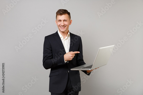 Cheerful young business man in classic black suit pointing index finger on laptop pc computer isolated on grey background in studio. Achievement career wealth business concept. Mock up copy space.