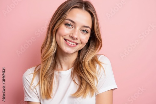 Cheerful Young Caucasian Woman with Long Blondes Hair Smiling at the Camera Against a Soft Pink Background - Capturing Joy and Confidence in Portrait Photography