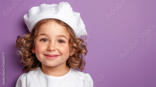 Cheerful young child in traditional attire with subtle smile against a solid color background