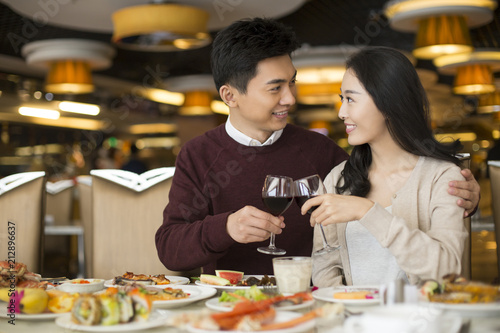 young couple, cheerful, chinese new year, eatery, buffet, dining, red wine, toast, dinner, dating, boyfriend, girlfriend, couple, dinner, people, two people, chinese, close to, happiness, abundance, variation, food, food and drink, epicure, drink, celebration, chinese culture, casual clothes, indoor, night, drinking, looking away, smiling, china, front view, waist up, husband, wife, face to face, missy, young men, asian ethnicity, asian, adults only, young adult, enjoyment, joy, leisure, lifestyle, togetherness, fruit, lunch, meal, dining table, wine, alcohol, wine glass, plate, meat, meal, holiday, table, traditional culture, sweater, fashion, city life, healthy eating, light, illuminated, bright, eating, holding, sitting, toothy smile, asia, beijing, east asia, photo, color image, selective focus, woman, female, man, male, adult, 20s, horizontal, lunar, new year