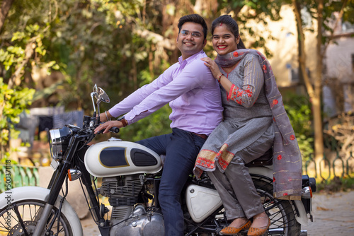 young, couple, indian, motorbike, riding, human relationships, bonding, dating, happiness, cheerful, enjoyment, avocation, togetherness, adult, male, man, woman, female, lifestyle, smiling, transportation, travel, sitting, holding, spectacle, half face, asian, horizontal, full-length