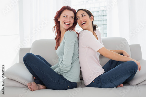 Cheerful young female friends sitting back to back in the living