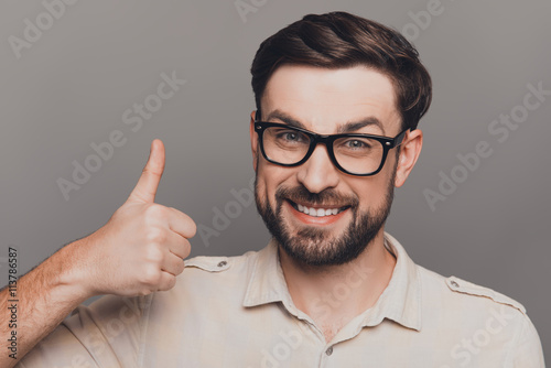 attractive, background, beard, bristle, brunet, business, businessman, cheerful, done, emotion, enjoy, fashion, finger, formal, freelancer, gesture, gesticulate, goggles, grey, guy, hand, photogenic, happiness, happy, intelligent, isolated, joy, leisure, lifestyle, like, male, man, manager, model, office, people, positive, professional, shirt, showing, signs, smile, spectacle, stubble field, student, style, symbol, thumb, up, young