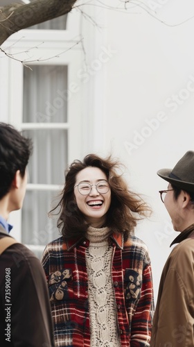 people, different, culture, chatting, happy, friends, woman, laughing, outdoors, urban, setting, smile, joy, fashion, diverse, group, friendship, young, adult, casual attire, clothing, eyeglass, winter, coat, knitwear, cheerful, interaction, multicultural, city, life, social, gathering, street, style, youth, vibrant, connection, positive, energy, togetherness, community, sidewalk