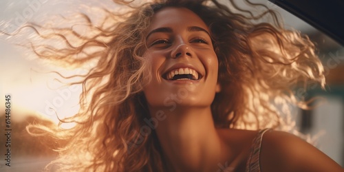 Cheerful young woman sitting on back seat of car while travelling. Young fun girl enjoying road trip. Traveling in car, generative ai