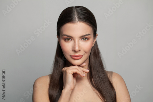 Cheerful young woman with clean healthy skin on white background. Beauty, facial treatment and cosmetic concept