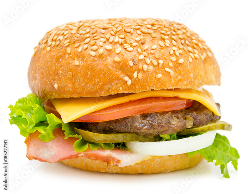 cheeseburger, hamburger, isolated, cutlet, chop, meat, cheese, bacon, pork meat, tomatoes, pickled, cucumber, onion, lettuce, closeup, green, bun, sesame, seed, white, background, piece, well, done, baked, baking, oily, toasted, brown, browned, piping, hot, roasted, fresh, tasty, appetising, delicious, fast, food, selective, sharpened, nobody, indoor, seasoning, cookery, spicey, cooking, catering, second, course