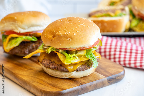 chips, hamburger, cheeseburger, burger, summer, grilled, lunch, sandwich, bun