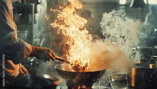 Chef cooking in a wok with fire and smoke coming out of it, commercial photography, high resolution,