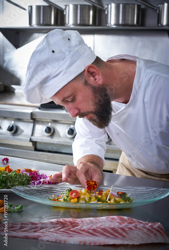 adult, beard, catering, caucasian, chef, closeup, cook, cooking, create, cookery, culinary, delicious, dish, expertise, flower, food, garnishing, epicure, hand, hat, healthy, indoor, ingredient, job, kitchen, male, man, meal, nourishment, occupation, people, person, portrait, preparation, prepare, prepared, preparing, profession, professional, eatery, salad, staff, stainless, standing, steel, uniform, work, working, young