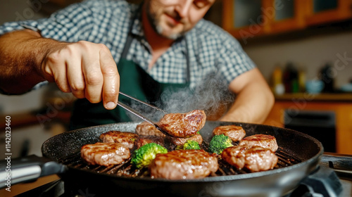 chef, cooking, meat, grill, pan, kitchen, food, broccoli, tongs, grilling, healthy, dinner, lunch, meal, cookery, eatery, culinary, epicure, delicious, hot, fresh, protein, vegetable, diet, nourishment, preparation, cook, homemade, domestic, indoor, home, steaming, heat