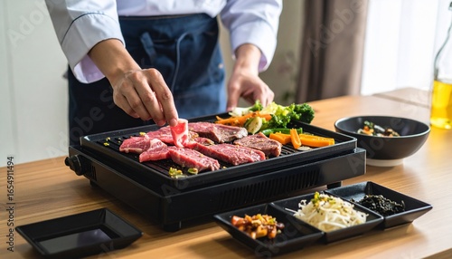 Chef Grilling Slices of Meat with Vegetables on a Tabletop Grill, Culinary Scene