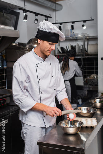 chef in uniform holding knife near raw egg above bowl while cooking in kitchen.