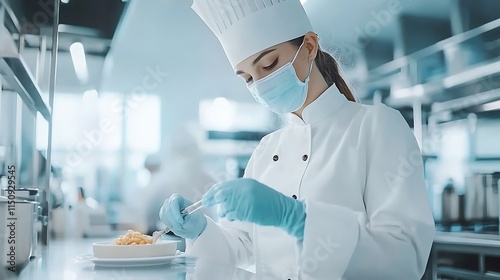 chef, kitchen, cooking, food, eatery, preparation, culinary, plate, epicure, professional, hygiene, glove, mask, cook, workspace, culinary arts, technique, meal, creativity, favor, delicious, vibrant, skill, tasty, menu, professionalism, ambience, focused, service, nourishment, efficiency, plating, ingredient, teamwork