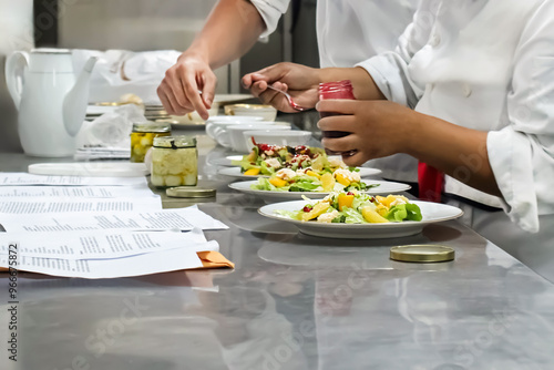 2, chef, assistant, instruction, culinary, kitchen, profession, class, plate, salad, education, receipe, team, work, preparation, hotel, event, party, service, indoor, professional, lunch, counter, fish, male, person, eatery, serving, banquet, catering, vegetable, sauce, cook, man, cookery, adult, hand, healthy, epicure, tasty, celebration, dish, meal, eating, food, fresh, dinner, table, cookery