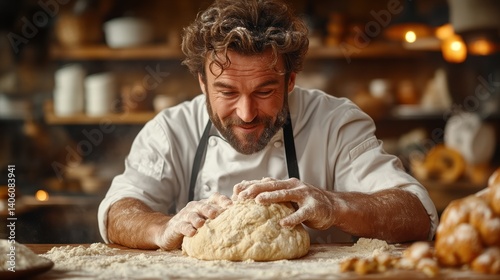 chef, kneading, dough, bakery, kitchen, culinary, expertise, artisanal, baking, skill, warm, lighting, inviting, atmosphere, scene, bread, pastry, flour, hand, work, professional, cook, food, preparation, receipe, ingredient, oven, fresh, homemade, delicious, aroma, craft, passion, occupation, career, hobby, lifestyle, health, nourishment, diet, meal, breakfast, lunch, dinner, snack, dessert