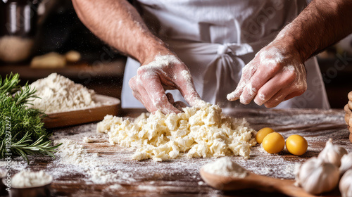 Chef kneading dough, making fresh pasta in a rustic kitchen
