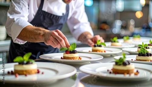 Chef meticulously plating gourmet desserts, adding fresh mint garnish to elegant dessert plates