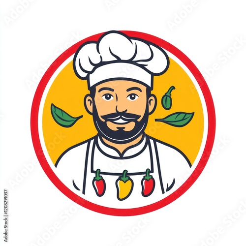 chef, portrait, cook, food, leaf, pepper, circle, kitchen, culinary, cooking, profession, design, illustration, eatery, service, uniform, apron, cartoon, person, art, graphic, drawing, character, professional, man, hat, moustache, facial, male, people, icon, vector, symbol, isolated, background, logotype, image, artwork, clip, shape, red, yellow, green, white, healthy, meal, ingredient, receipe, eating