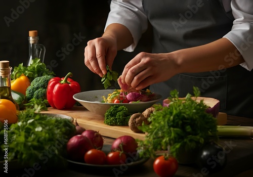 Chef Preparing a Colorful and Healthy Salad with Fresh Vegetables and Herbs for a Nutritious Meal