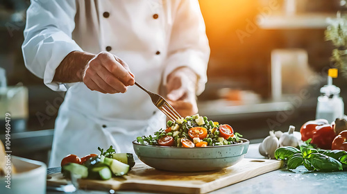 Chef preparing a fresh vegetable salad in a modern kitchen