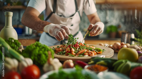 chef, preparing, vibrant, dish, modern, kitchen, fresh, ingredient, meticulous, presentation, colourful, image, process, cooking, culinary, food, epicure, cookery, creation, vegetable, herb, seasoning, professional, apron, glove, chopping, cutting, skill, preparation, delicious, healthy, meal, artistry, plating, garnish, precision, art, technique