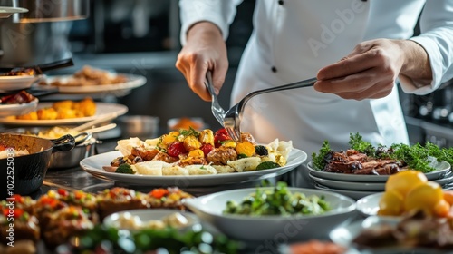 Chef preparing an exquisite buffet with a variety of dishes. A display of culinary expertise and artistic presentation in a professional kitchen.