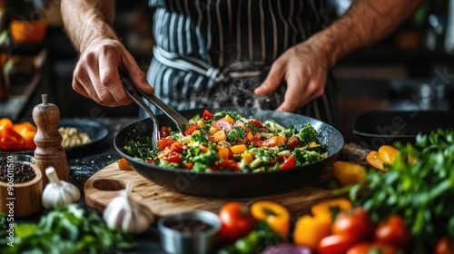 chef, vegetable, stir fry, kitchen, ingredient, cooking, fresh, food, healthy, rustic, preparation, diet, epicure, culinary, cookery, wooden, countertop, garlic, herb, spice, pepper, tomatoes, broccoli, colourful, meal, delicious, homemade, professional, apron, hand, nourishment, vegetarian, vegan, oil, frying pan, pan, tongs, chopping, slicing, culinary arts, organic, vibrant, pepper, chopping board, parsley