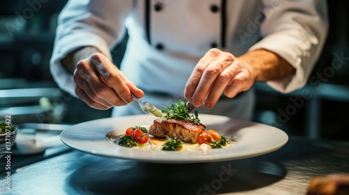 Chef Preparing Gourmet Food Plating Fish Dish in Professional Kitchen