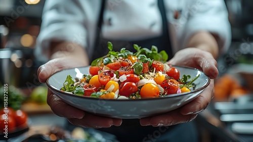 chef, salad, tomatoes, cherry, herb, grain, bowl, food, healthy, fresh, delicious, cookery, cooking, eatery, kitchen, meal, dinner, lunch, plate, hand, presentation, organic, alimentary, tasty, appetising, vibrant, colourful, ingredient, vegetable, receipe, dietary, diet, eating, lifestyle, epicure, culinary, art, style, dish, serving, prepare, cook, mixed