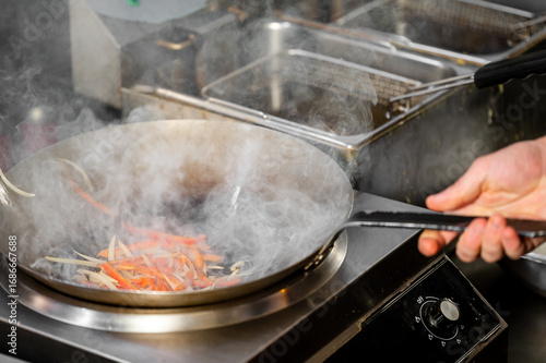 chef, cooking, stir fry, vegetable, red pepper, bean sprouts, pan, wok, steam, heat, kitchen, commercial, professional, food, cookery, culinary, eatery, burner, flames, frying, sauté, asian cuisine, healthy, fresh, preparation, cook, hand, action, smoke, metal, container, gastronomy, hot, meal, dinner, lunch, service, hospitality, equipment, utensil, gas, stove, receipe, ingredient, fast food, kitchen utensile, interior