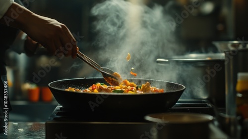chef, cooking, food, dish, pan, kitchen, tongs, stir, steaming, hot, vegetable, meat, sauce, smoke, steam, kitchen utensile, utensil, eatery, culinary, professional, preparation, meal, dinner, lunch, savoury, favor, aromatic, tasty, delicious, fresh, ingredient, expertise, skill, craft, tool, process, heat, oil, sizzling, art, gastronomy