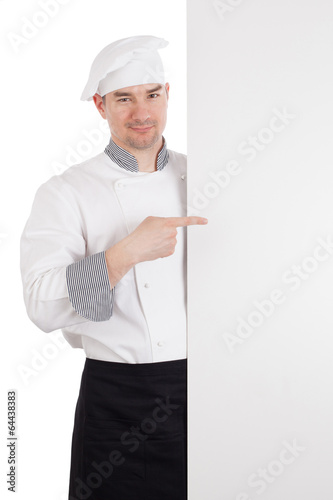cook, adult, apron, background, caucasian, chef, cookery, culinary, expression, face, hat, kitchen, man, people, person, professional, service, white, men at work, young, occupation, eatery, uniform, workwear, job, smile, smiling, standing, blank, board, looking, holding, paper, showing, banner, enjoy, skill, pointing, finger