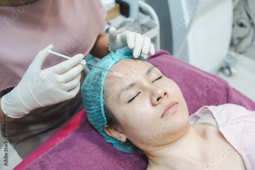 Chemical injections for facial skin care on the forehead of an Asian woman, in a beauty clinic.