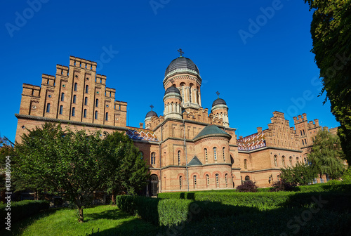 Chernivtsi National University. Metropolitans wing of ex Residence of Bukovinian and Dalmatian ones. Byzantine and Moorish architecture. Postcard style.