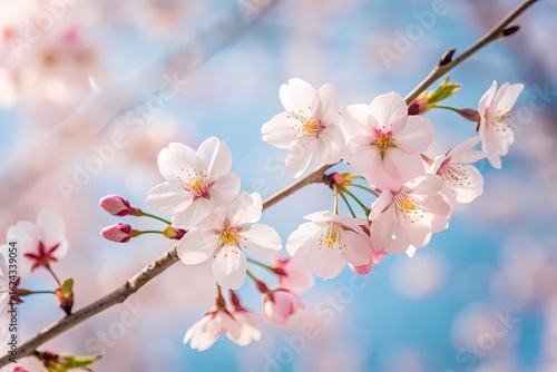 Cherry blossom branch with pastel pink and white petals, sky blue background in full blur, macro capture from below looking up